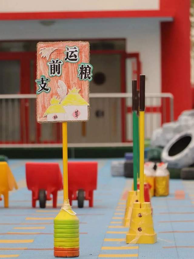 小朋友们依次跨过障碍物,快速跑到堆放粮食的地点,背起粮食包,钻过山洞,把粮食包放到粮站,做好后勤保障。