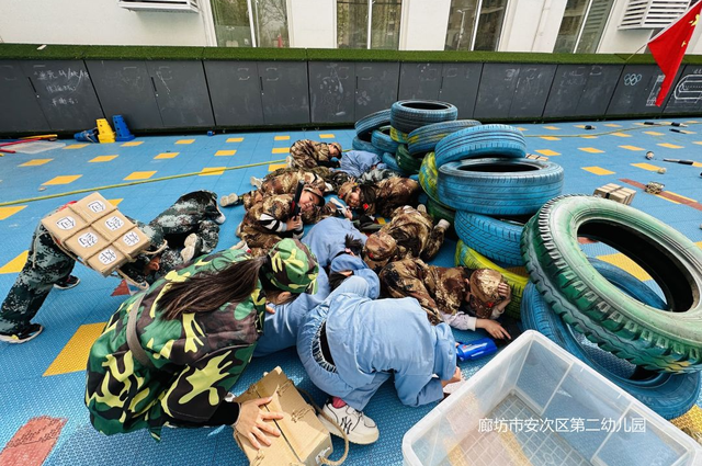 老师和孩子们利用体育器材包、轮胎、迷彩网、废旧纸箱等户外游戏材料精心布置了重重关卡。孩子们合作互助,不怕困难,在关卡中通过攀爬、匍匐、投掷等方式,最终突破重重阻碍,取得了“胜利大会师”。快让我们一起去看看孩子们精彩的表现吧!