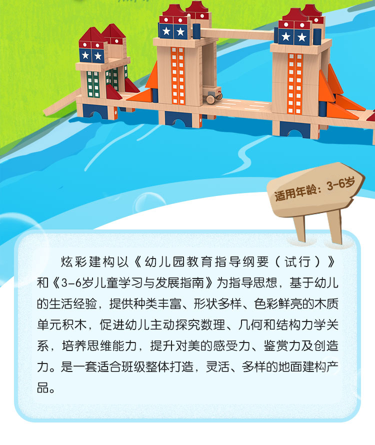 基础件:半单元积木、单元积木、双单元积木、四倍单元积木、三角形积木、柱形积木、圆柱积木、斜坡积木、屋檐积木等,3个年龄段共948件